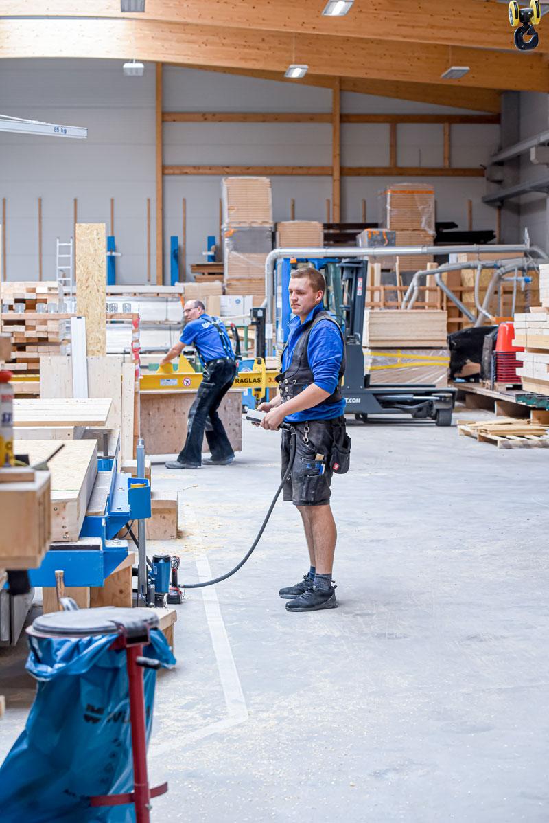LKW, Kran, Wechselbrücken, Fertigungstische, Einblasmaschine, Laserscanner und viele mehr gehören zur firmeneigenen Ausstattung. Im Neubau sorgt der hohe Vorfertigungsgrad in der Halle dafür, dass das Arbeiten auf der Baustelle körperschonender geworden ist.