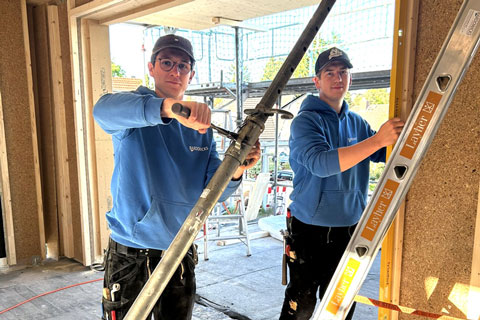 - Erlernen von Richten von Holzkonstruktion gemäß Plan (Haus, Aufstockung, Dachstühle) auf der Baustelle